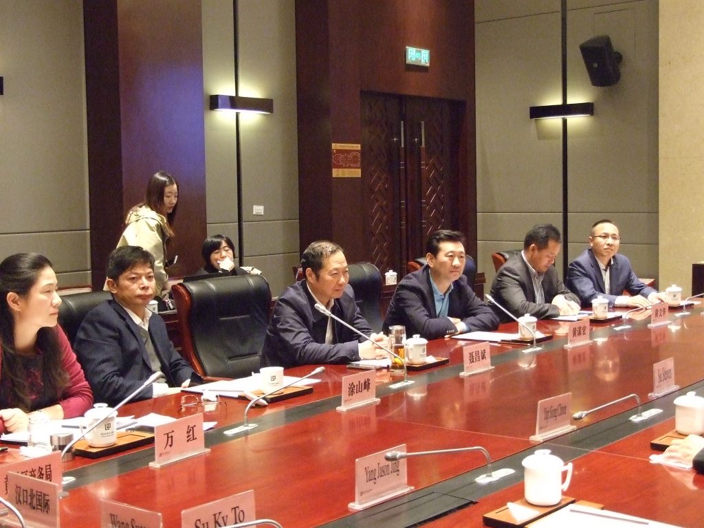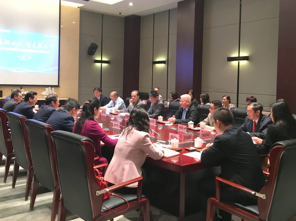 隨後,考察團前往商務廳,參加在二樓會議室舉行的座談會。 湖北省人民政府辦公廳巡視員聶昌斌 ,湖北省商務廳副廳長黃謀宏, 武漢海關副關長高正太,湖北出入境檢驗檢疫局副局長宋軍,武漢市人大常委會祕書長涂山峯,中信保武漢營管部總經理劉正茂,省商務廳外貿處、市商務局外貿處負責人參加了座談會。湖北省人民政府辦公廳巡視員聶昌斌介紹漢口北市場採購、湖北自貿區及招商引資優惠政策,武漢市人大祕書長涂山峯介紹武漢市招商引資政策及漢口北試點發展情況,武漢海關副關長高正太介紹漢口北市場採購海關政策,湖北省出入境檢驗檢疫局副局長宋軍介紹漢口北市場採購檢驗檢疫政策,中信保武漢營管部總經理劉正茂介紹爲漢口北市場採購入住企業提供的信保服務。雙方就漢口北市場採購有關問題進行交流。